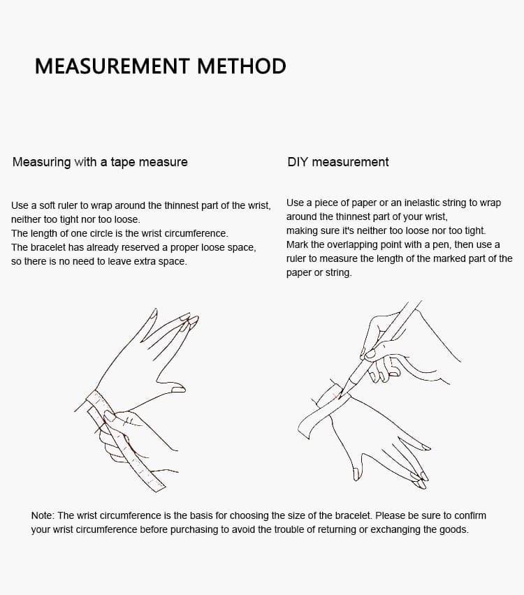 Measurement Method: Use a soft tape measure or strip of paper to wrap snugly around the narrowest part of your wrist, leaving no gap. Read or mark the length.
